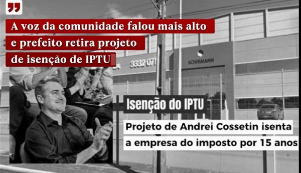 Prefeito Cossetin projeta isentar a empresa Schirmann Representações do IPTU, e gera polêmica