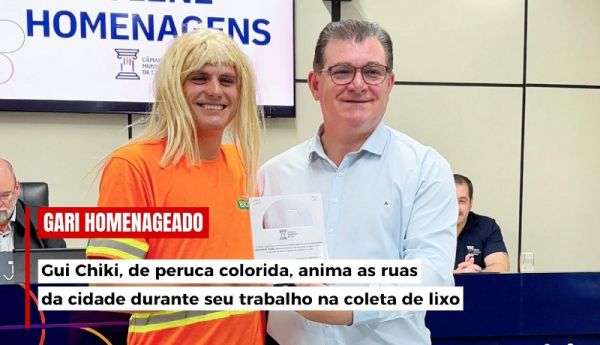 ▶️▶️ A Câmara de Vereadores de Ijuí viveu um momento inédito na noite desta segunda-feira (17/11). Pela primeira vez na história do município, um gari recebeu uma homenagem oficial no plenário. O reconhecido foi Guilherme Grochanke Vieira, 24 anos, mais conhecido pela população como Gui Chiki, personagem que ele interpreta com uma peruca colorida enquanto anima as ruas da cidade durante o trabalho no caminhão de lixo.