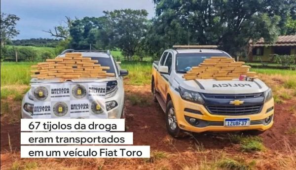 ✔✔ A Polícia Rodoviária Estadual (PRE), do posto de Santo Augusto, apreendeu quase 50 quilos de maconha na tarde deste sábado (10/1). A droga estava acondicionada em 67 tijolos e era transportada em um veículo Fiat Toro.