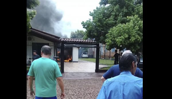 Um carro pegou fogo na garagem de uma residência no bairro Morada do Sol, na tarde deste domingo (10). As chamas se alastraram e atingiram também parte da casa.