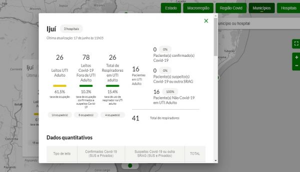 Os dados atualizados da secretaria de Saúde do Estado (SES-RS) sobre o novo coronavírus mostram que o município de Ijuí possui 26 leitos UTI adultos equipados com respiradores. 16 deles estão ocupados, mas apenas quatro utilizam respiradores.