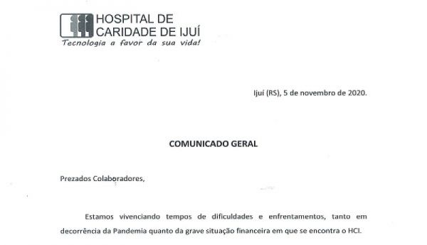 O presidente do Hospital Caridade de Ijuí (HCI), Paulo Stumm, comunica aos colaboradores que neste ano eles não receberão o Chester de Natal, por causa da grave crise financeira da Instituição.