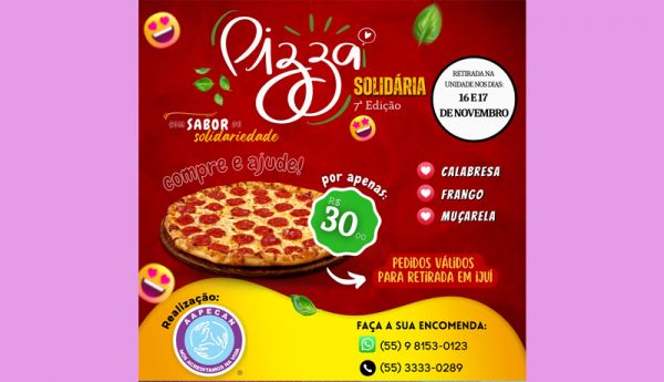 A Associação de Apoio a Pessoas com Câncer – Aapecan Ijuí, realiza a 7ª Edição da Pizza Solidária - com sabor de solidariedade. A ação visa arrecadar recursos para a compra das cestas de natal, que serão distribuídas para 210 usuários da Unidade Ijuí.