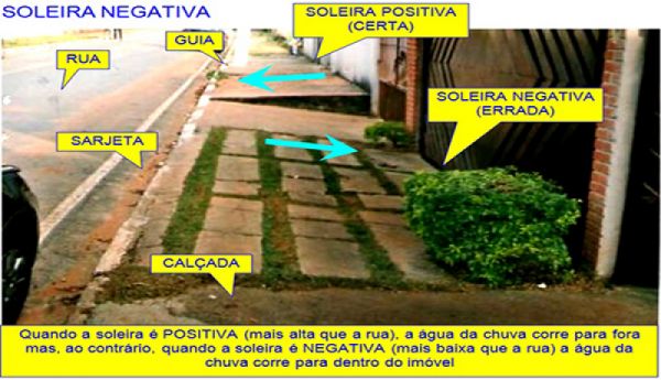 As normas técnicas determinam um caimento mínimo de 2% para garantir o escoamento da chuva sem que haja refluxo. A Chuva de Verão é rápida e muito intensa formando enxurradas que correm pelas sarjetas.