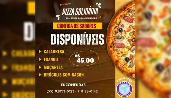 A Aapecan Ijuí promove a 9ª edição da Pizza Solidária, com sabor de solidariedade. Compre uma pizza grande, por apenas R$ 45, e ajude a instituição a manter seu trabalho junto às pessoas em tratamento oncológico.