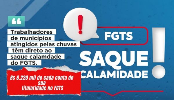 O Saque Calamidade permite ao trabalhador sacar até R$ 6.220,00 de cada conta de sua titularidade no FGTS, limitado ao saldo disponível, por motivo de necessidade pessoal, urgente e grave em caso de desastre natural (alagamentos, deslizamentos de terra, fortes chuvas etc.) que tenha atingido sua residência, após declaração oficial da Defesa Civil de seu município.